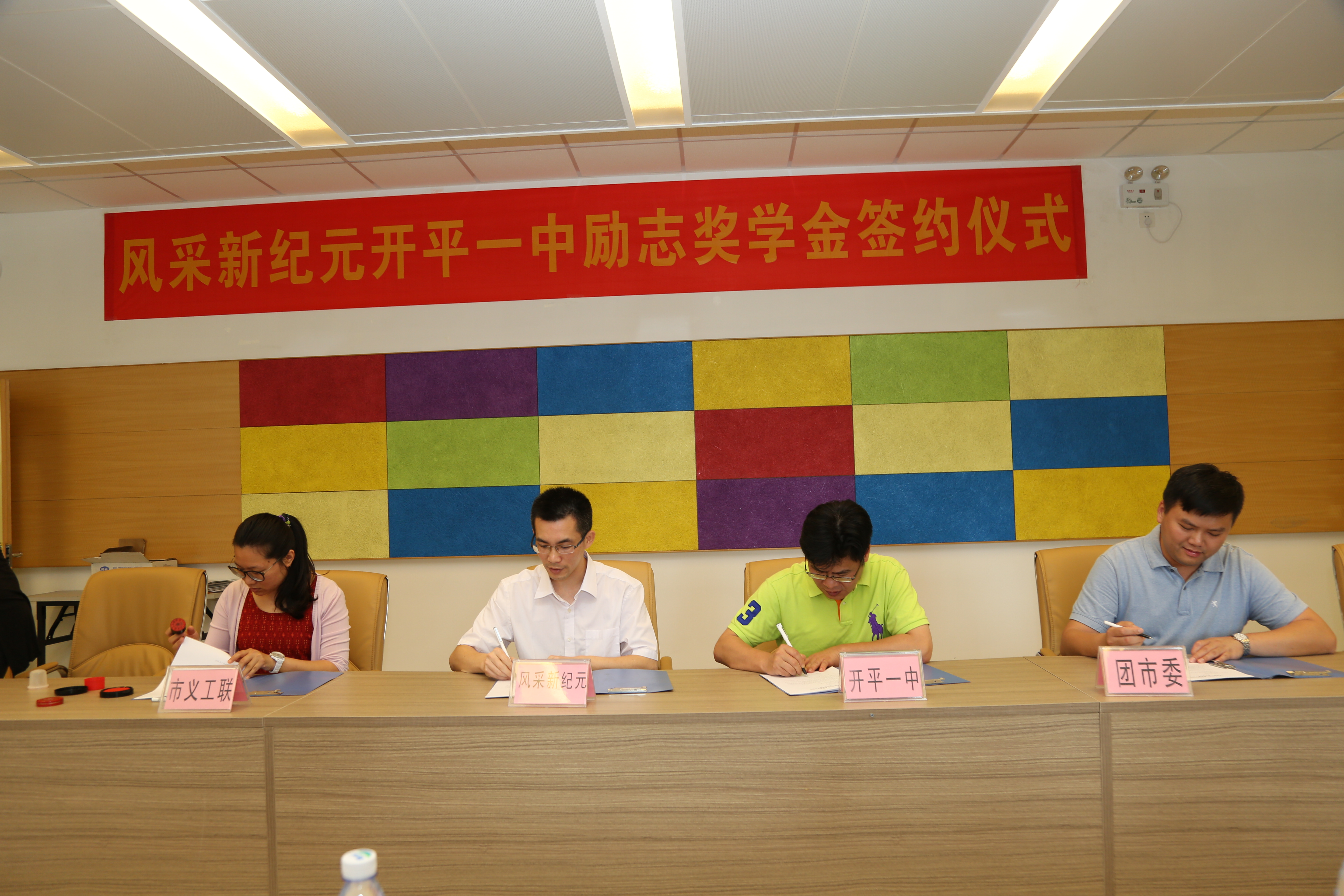 共青团开平市委书记梁文斌、开平市义工联秘书长邝小虹、开平市第一中学校长王瑞宏、广东风采新纪元律师事务所合伙人贺国帅、甄松杰等出席了签字仪式。仪式后进行了首期励志奖学金的交接。
