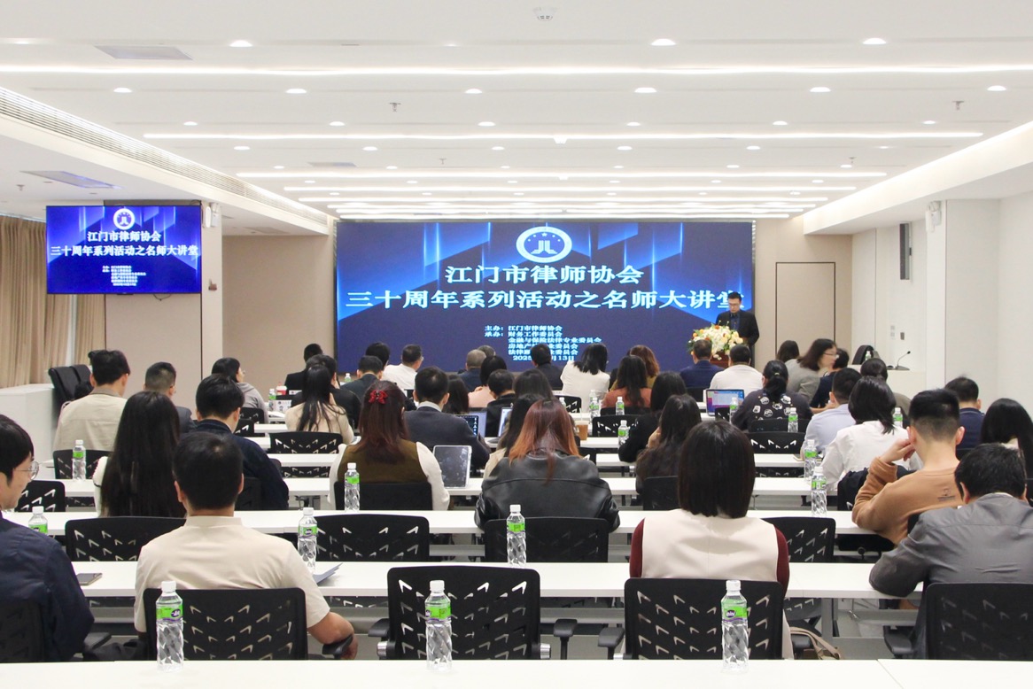 为庆祝江门市律师协会成立三十周年,聚焦财税法律服务领域前沿热点问题,助力我市律师开拓业务新赛道,市律协财务工作委员会、金融与保险法律专业委员会、房地产法专业委员会、法律顾问专业委员会联合举办“江门市律师协会成立三十周年之名师大讲堂”活动,市律协会长李静染,监事长邝日勇,副会长谭社芬、许炳权、何文慧,副监事长徐林英、黎雄校及全市各律师事务所律师、实习人员踊跃参与。本次活动由金融与保险法律专业委员会主任叶英鹏担任主持人。